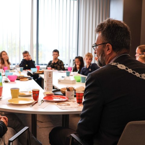 Op 9 oktober vond het jaarlijkse Burgemeestersontbijt plaats. Leerlingen van groep 8 van verschillende basisscholen uit onze gemeente schoven aan voor een gezond ontbijtje én een goed gesprek met burgemeester Michael Rauner en wethouder Claudia Ponjee.