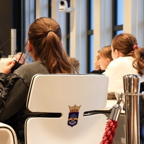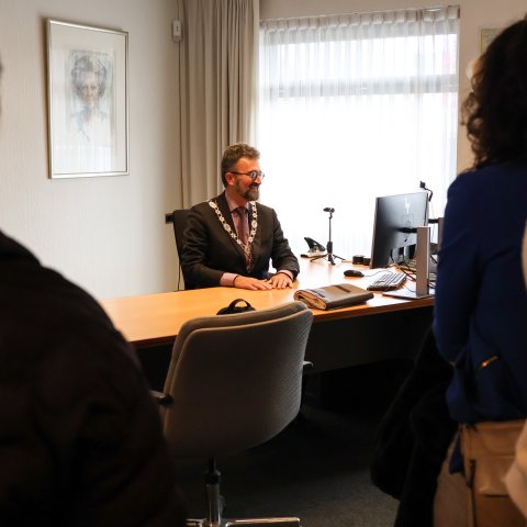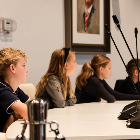 Ook een rondleiding door de bestuursvleugel inclusief een kijkje in de werkkamers van de burgemeester en wethouders mocht voor deze jonge inwoners niet ontbreken.